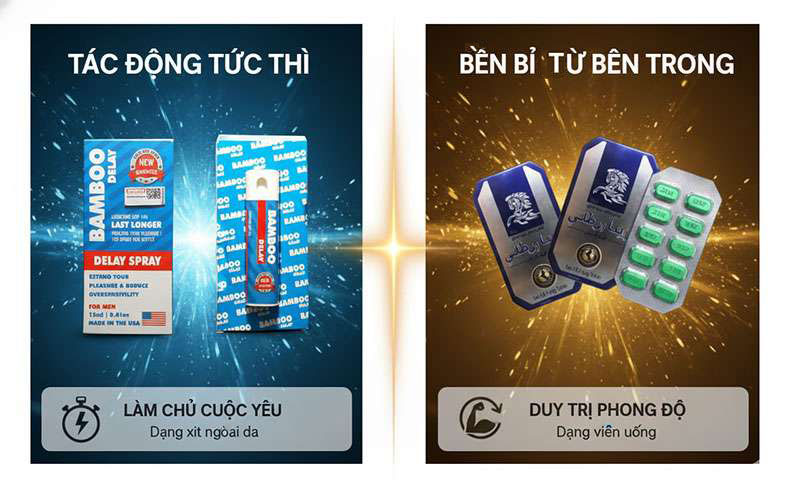 Dưới đây là bảng so sánh chi tiết giữa hai sản phẩm bạn hỏi: Bamboo Delay Spray 12ml (xịt kéo dài cuộc yêu) và dạng viên (thuốc viên uống nâng cao sinh lý):